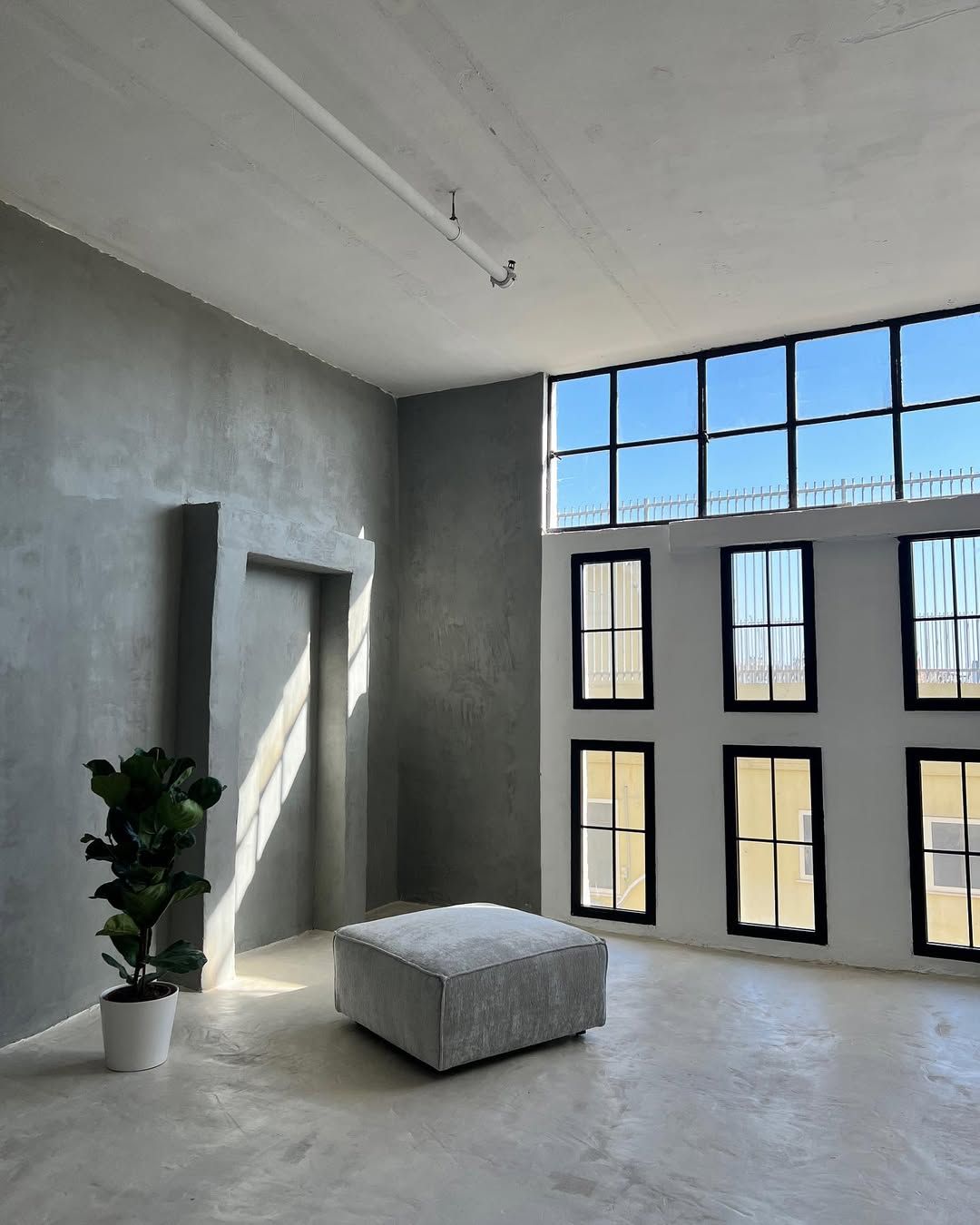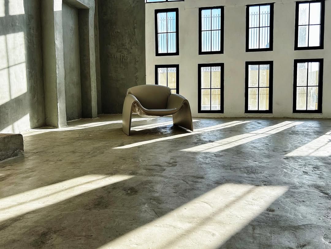 - Зал с отделкой “под бетон”, с рельефными стенами и геометрическими фигурами
